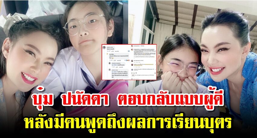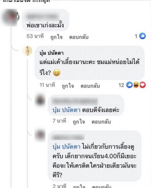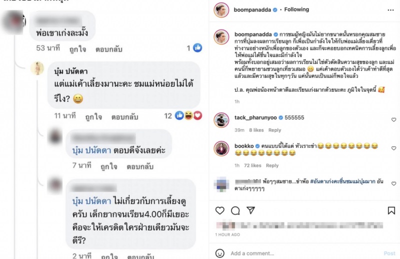 “พ่อเขาเก่งละมั๊ง” ซึ่งสาว บุ๋ม ปนัดดา “รีบเข้าไปตอบกลับว่า แต่แม่เขาเลี้ยงมานะคะ ชมแม่หน่อยไม่ได้รึไง” หลังจากนั้นเธอได้นำโพสต์ดังกล่าวมาโพสต์ผ่านอินสตาแกรมส่วนตัว พร้อมระบุข้อความว่า