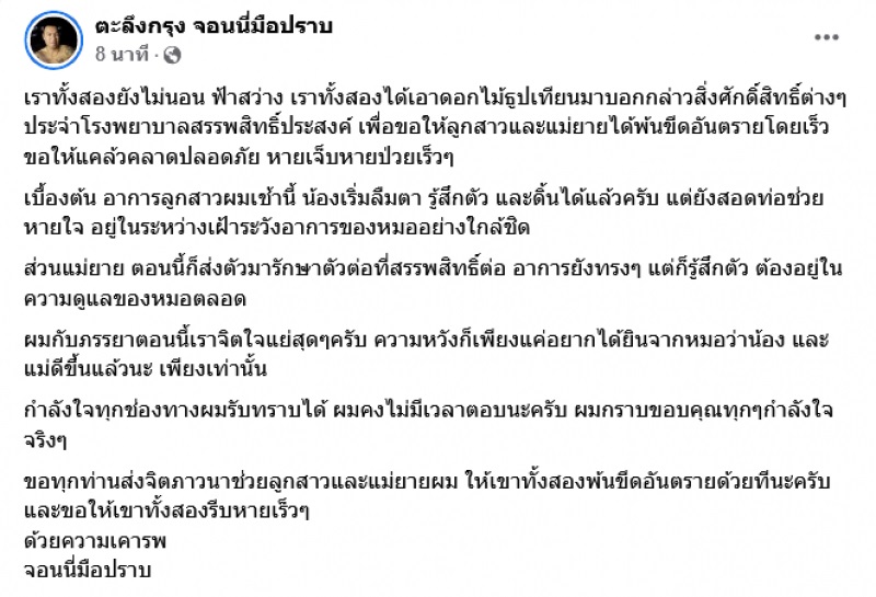 ความหวังก็เพียงแค่อยากได้ยินจากหมอว่า น้องและแม่ดีขึ้นแล้วนะ เพียงเท่านั้น กำลังใจทุกช่องทางผมรับทราบได้ ผมคงไม่มีเวลาตอบนะครับ ผมกราบขอบคุณทุก ๆ กำลังใจจริง ๆ ขอทุกท่านส่งจิตภาวนาช่วยลูกสาวและแม่ยายผม ให้เขาทั้งสองพ้นขีดอันตรายด้วยทีนะครับ และขอให้เขาทั้งสองรีบหายเร็ว ๆ ด้วยความเคารพ จอนนี่มือปราบ” อย่างไรก็ตามขอให้ทั้งคู่กลับมาแข็งแรง ปลอดภัยโดยเร็วด้วยนะครับ