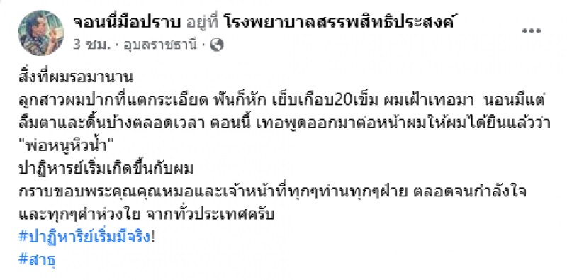 ล่าสุด เมื่อช่วงบ่ายวันนี้ (12 เม.ย.) จอนนี่มือปราบ ได้อัปเดตอาการบุตรสาวผ่านเฟซบุ๊กว่า สิ่งที่ผมรอมานาน ผมเฝ้าเธอมา นอนมีแต่ลืมตาและดิ้นบ้างตลอดเวลา ตอนนี้ เธอพูดออกมาต่อหน้าผมให้ผมได้ยินแล้วว่า “พ่อหนูหิวน้ำ” ปาฏิหาริย์เริ่มเกิดขึ้นกับผม กราบขอบพระคุณคุณหมอ และเจ้าหน้าที่ทุก ๆ ท่าน ทุก ๆ ฝ่าย ตลอดจนกำลังใจและทุก ๆ คำห่วงใย จากทั่วประเทศครับ