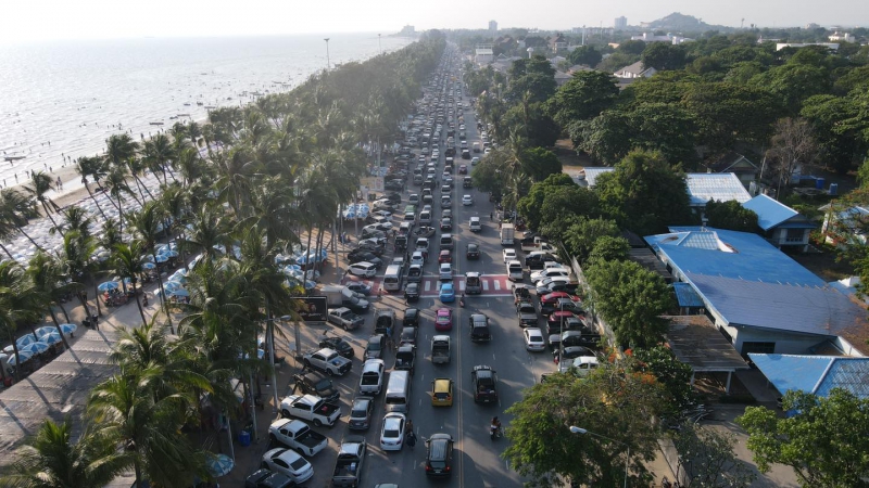 ถนนเลียบชายหาด รถมากเคลื่อนตัวสลับหยุดนิ่ง จากการชะลอหาที่จอดรถของนักท่องเที่ยว