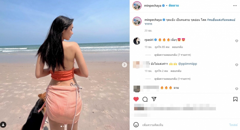 ล่าสุดสาว มิน ออกมาโพสต์ภาพเซ็กซี่ริมชายหาด พร้อมแคปชั่นสุดอ้อน ที่หนุ่ม ๆ เห็นต้องรีบเข้ามาคอมเมนต์ทันทีว่า “จุดแข็ง เป็นคนสวย จุดอ่อน โสด #คนอื่นแต่งกันหมดแย้ววววว”