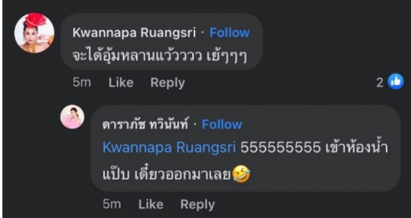 โดยสาว ลาล่า อาร์สยาม ก็เข้ามาคอมเมนต์ว่า “จะได้อุ้มหลานแว้วววว เย้ๆๆๆ” แต่พออ่านคอมเมนต์ดี ๆ กลับกลายเป็นว่าท้องนั้นคือพุงน้อย ๆ ที่บวมขึ้นเพราะความอิ่มนั่นเอง เพราะสาว ธัญญ่า รีบเข้ามาตอบคอมเมนต์พี่สาวคนสนิทว่า “555555555 เข้าห้องน้ำแป๊บ เดี๋ยวออกมาเลย” ถือว่าเคลียร์ประเด็นดังกล่าวได้เป็นอย่างดี สรุปว่าทั้งคู่ยังไม่มีน้องนะจ้า