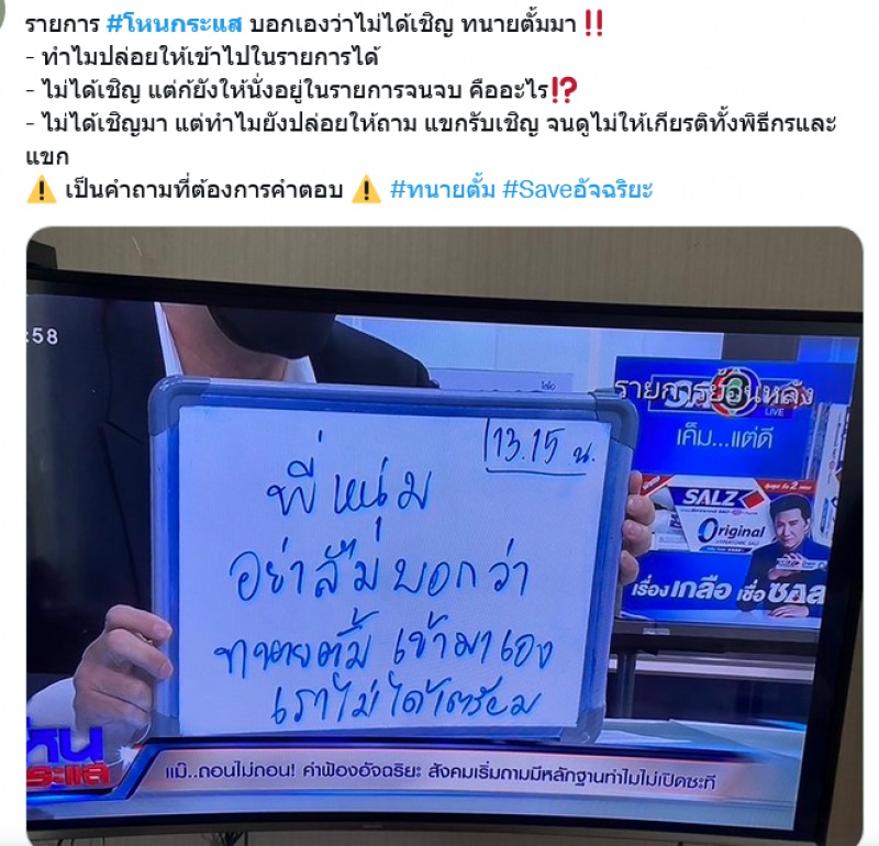 โดยคุณอัจกล่าวว่ามันเหมือนวางแผนกันไว้แต่แรกแล้วว่า ตั้มมา ปอเข้าสาย แซนเข้าสาย กระติกเข้าสาย จ๊อบเข้าสาย อย่างนี้ พฤติกรรมมันเห็นชัดอยู่แล้ว ภรรยาผมยังไม่เคยโกรธใครนะยังโทรมาจวกพี่หนุ่ม (พร้อมกับเปิดแชทให้ผู้สื่อข่าวดูว่าภรรยาไม่พอใจ)