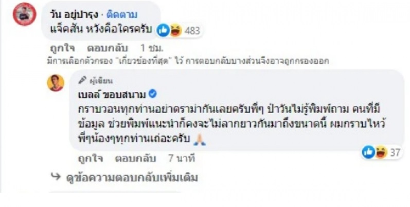 โดยงานนี้ วัน อยู่บำรุง ได้เข้าไปถาม เบลล์ ขอบสนาม ว่า แจ็คสัน หวัง คือใคร ก่อนจะโดนแฟนคลับ GOT7 ถล่มยับ ถึงขั้น เบลล์ ขอบสนาม ต้องเข้ามาขอยุติดราม่า ด้วยข้อความว่า “กราบวอนทุกท่านอย่าดราม่ากันเลยครับพี่ ๆ ป๋าวันไม่รู้พิมพ์ถาม คนที่มีข้อมูล ช่วยพิมพ์แนะนำก็คงจะไม่ลากยาวกันมาถึงขนาดนี้ ผมกราบไหว้พี่ ๆ น้อง ๆ ทุกท่านเถอะครับ”