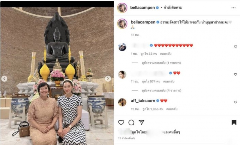 ล่าสุดสาว เบลล่า ได้โพสต์ภาพขณะอยู่ในวัดกับคุณแม่ปราณี ให้แฟน ๆ ได้ชมกัน พร้อมแคปชั่นว่า “นำบุญมาฝากทุกคนนะคะ” หลังจากนั้นมีทั้งเพื่อน ๆ ในวงการรวมทั้งแฟนคลับเข้ามากดไลค์และคอมเมนต์แสดงความคิดเห็นกันเป็นจำนวนมาก โดยเฉพาะสาว แอฟ ทักษอร ที่เข้ามาคอมเมนต์ด้วยอิโมจิรูปหัวใจ เพื่อเป็นกำลังใจให้สาว เบลล่า ต้องบอกว่าเป็นมิตรภาพที่น่าชื่นชมมาก ๆ