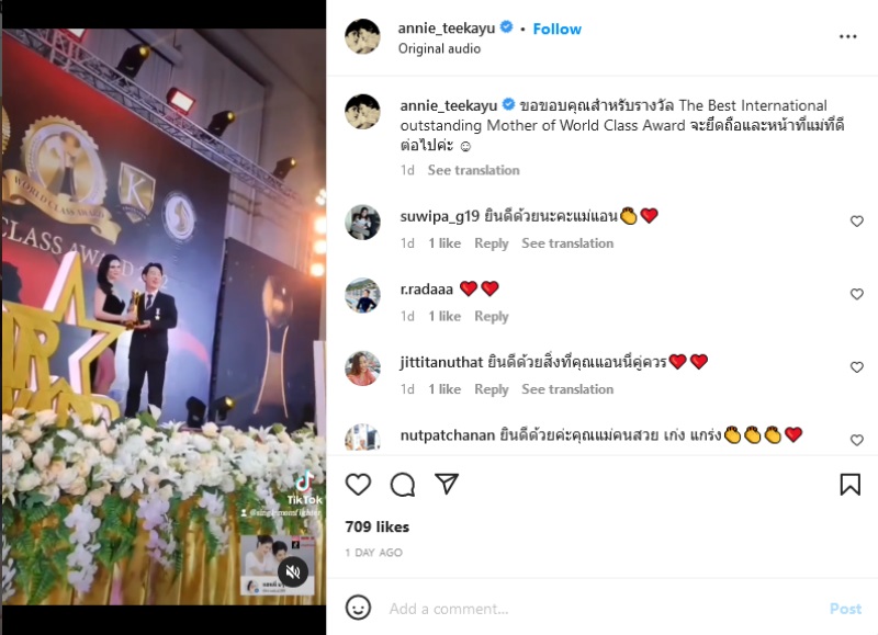 ล่าสุดสาว แอนนี่ รู้สึกภูมิใจในตัวเองมาก ๆ เมื่อเธอได้รับรางวัลคุณแม่ดีเด่นระดับโลก! โดยสาว แอนนี่ ได้โพสต์คลิปขณะขึ้นไปรับรางวัล พร้อมแคปชั่นว่า “ขอขอบคุณสำหรับรางวัล The Best International outstanding Mother of World Class Award จะยึดถือและหน้าที่แม่ที่ดีต่อไปค่ะ”