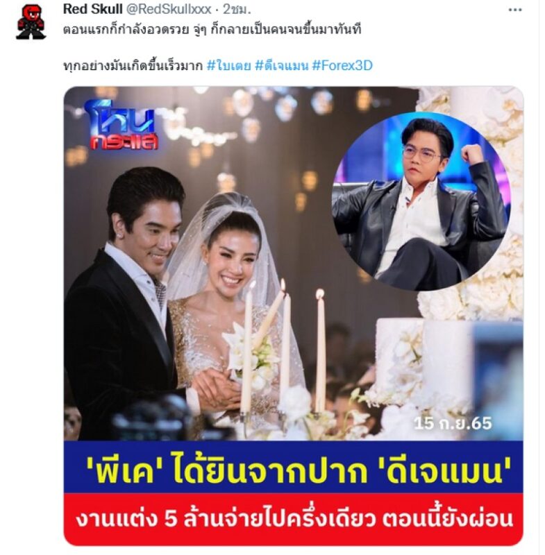 พีเค เอาอย่างนี้ ด้วยความที่ผมได้ยินจากปากของแมนเอง หลายคนจะพูดถึงวิธีการใช้ชีวิต เรื่องงานแต่งงานอะไรอันนี้ไม่รู้นะ แล้วแต่เขา แต่ด้วยความที่ได้ยินจากปากของแมนเอง เขาบอกว่ามูลค่าในการจัดงานแต่งของเขา 5 บาท ตอนนี้จ่ายไปครึ่งหนึ่งแล้ว และทุกวันนี้เขาบอกว่ายังผ่อนอยู่เลย ส่วนเรื่องของความถูกผิดของกฎหมายก็รอติดตามตอนต่อไปเอาก็แล้วกัน