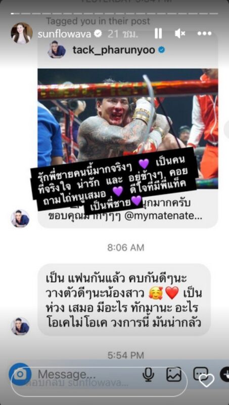 หลังจากนั้นสาว เอวา ได้ตอบกลับไปว่า “รักพี่ชายคนนี้มากจริง ๆ เป็นคนที่จริงใจ น่ารัก เเละอยู่ข้าง ๆ คอยถามไ ถ่หนูเสมอ ดีใจที่มีพี่แทคเป็นพี่ชาย”