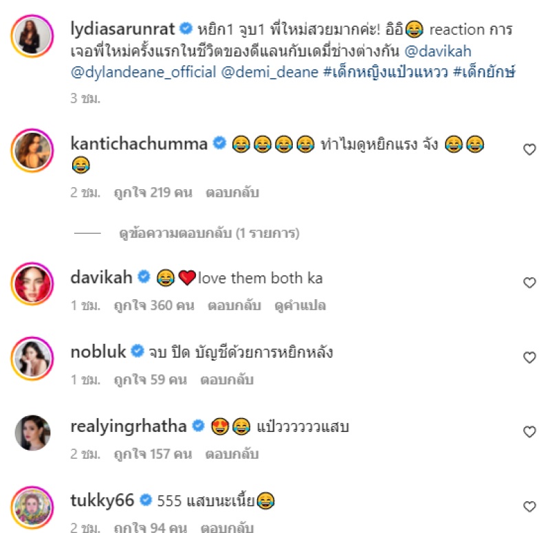 พร้อมแคปชั่นว่า ห ยิ ก 1 จู บ 1 พี่ใ ห ม่สวยมากค่ะ อิอิ reaction การเจอพี่ใ ห ม่ครั้งแรกในชีวิตของดีแลนกับเดมี่ช่างต่างกัน เ ด็ กหญิง แ ป๋ ว แ ห ว ว เ ด็ กยั ก ษ์ หลังจากนั้นก็มีเพื่อน ๆ ในวงการรวมทั้งแฟนคลับเข้ามาแสดงความคิดเห็นกันเป็นจำนวนมาก