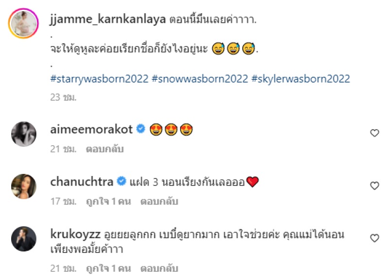 ล่าสุดสาว เจมส์ ได้โพสต์ค ลิ ปน้องแฝ ด 3 กำลังหลับ และให้ดูใ บห น้ าที่เ ห มือนกันของน้องแฝ ดชาย พร้อมระบุแคปชั่นว่า “ตอนนี้มึ นเลยค่าา จะให้ดูหูละค่อยเรียกชื่อก็ยังไงอยู่นะ starrywasborn2022 snowwasborn2022 skylerwasborn2022”
