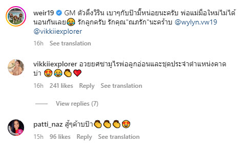 หลังจากนั้นสาว วิกกี้ ก็เข้ามาคอมเมนต์ทันทีว่า “อ ว ยย ศซามูไรพ่อลู กอ่ อ นและชุดประจำตำแหน่งค าดบ่า” ส่วน คุณแม่พ ล อ ยไ พลิ น ก็คอมเมนต์ส่งกำลังใจให้ลู กชายด้วยว่า “สู้ ๆ ค้าบป๊า”