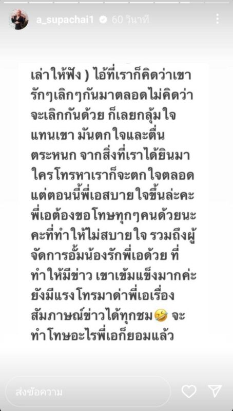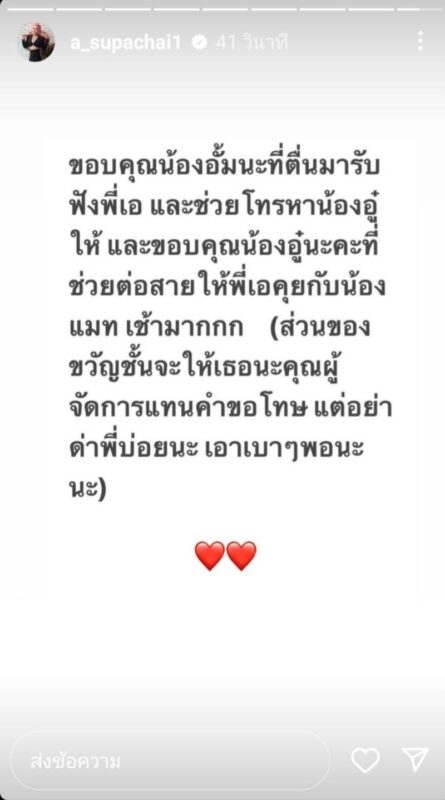 หลังจากนั้น พี่เอ ศุภชัย ก็ไม่ได้นิ่ งนอนใจ ติดต่อไปยังสาว แมท เพื่อขอโท ษและปรั บความเข้าใจกัน ซึ่งมีร ายละเอี ยด ดั งนี้