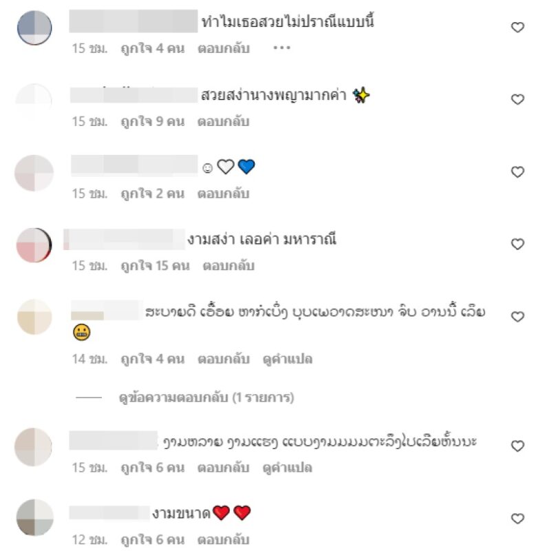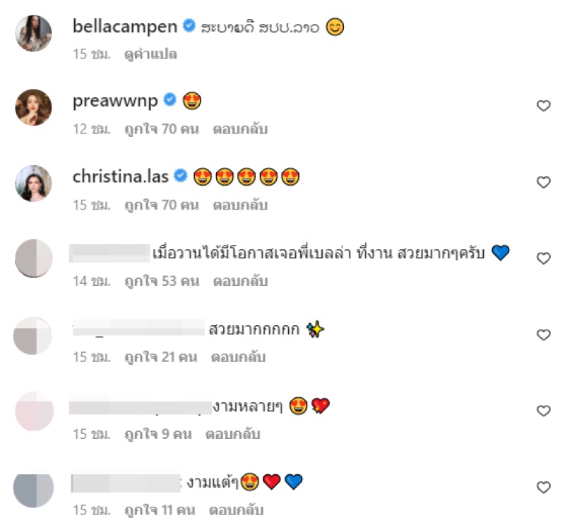 งานนี้สาว เบลล่ า ได้โพสต์ภาพในลุ ค สวย หวาน ดั่ งกุ ลส ตรีไทย พร้อมแคปชั่นทักทายแฟน ๆ สปป.ลา ว ว่า ສະບາຍດີ ສປປ.ລາວ ซึ่งก็มีทั้งเพื่อน ๆ ในวงการรวมทั้งแฟนคลับเข้ามากดไลค์กันแบบรัว ๆ พร้อมกับคอมเมนต์ชื่นชมความสวยของเธอกันเป็นจำนวนมาก