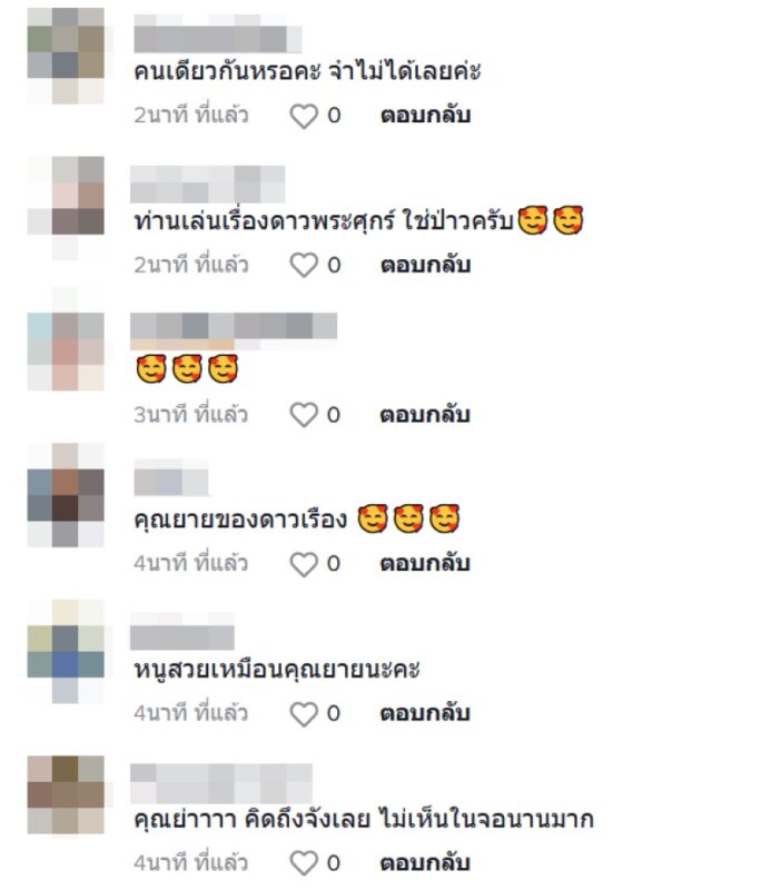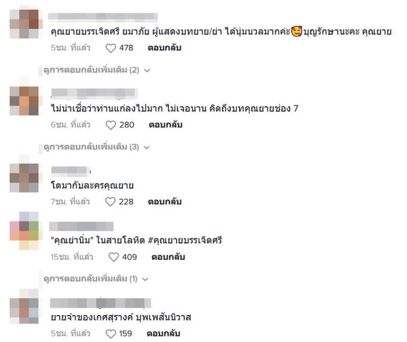 หลังจากนั้นก็มีชาวเน็ตเข้ามาคอมเมนต์แสดงความคิดเห็นกันเป็นจำนวนมาก อาทิ ไม่น่าเชื่อว่าท่านสู งวั ยขึ้นไปมาก ไม่เจอนาน คิดถึงบทคุณยายช่อง 7, โตมากับละครคุณยาย, ยายจ๋าของเกศสุร างค์ บุพเพสันนิวาส, อายุยื นมากครับ, บท คุณย่า คุณยาย ที่ละมุน อบอุ่นทุกครั้งที่ดูละครค่ะ เป็นต้น
