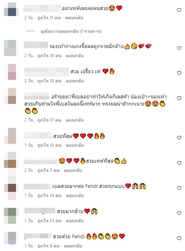 งานนี้ทำเอาเพื่อน ๆ ในวงการรวมทั้งแฟนคลับเข้ามากดไลค์กันแบบรัว ๆ พร้อมกับคอมเมนต์ชื่นชมความสวยของสาว เบลล่ า กันเป็นจำนวนมาก อาทิ สวย เท่ สุดใจ ยัยหนูเบลของป้า, อย่าเท่เลยค่ะคนสวย, รองเท้ากางเกงจิ๊ ดดดถูกจายมั่กค๊าบ เป็นต้น