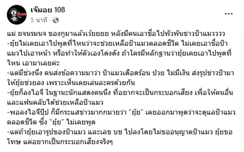 แต่มีช่วงนึง คนส่งข้อความมาว่า ป้าแมวเ ดือ ดร้อ น ป่ วย ไม่มีเ งิน ส่งรูปข่าวป้ามาให้ ยุ้ย ช่วยลง เพราะเห็นว่าเคยเล่นละครด้วยกัน ยุ้ย ก็ลงไอจีในฐานะนักแสดงคนนึง ที่อยากจะเป็นกระบอ กเสียง เพื่อให้คนอื่น และแฟนคลับได้ช่วยเหลื อ ป้าแมว